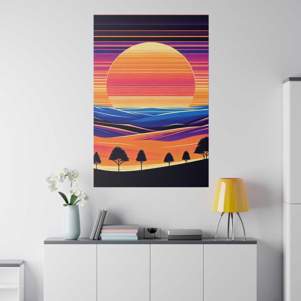 The Sun Sets on Aiden Stormhall Aiden Stormhall – Minimalist Sunset is a stunning representation of the beauty and tranquility of a sunset. The canvas portrays a minimalist landscape, with a lone tree standing tall against a backdrop of vibrant colors. The sky is ablaze with hues of orange, pink, and purple, creating a sense of warmth and serenity. The simplicity of the composition allows the viewer to focus on the beauty of the colors and the peacefulness of the scene.